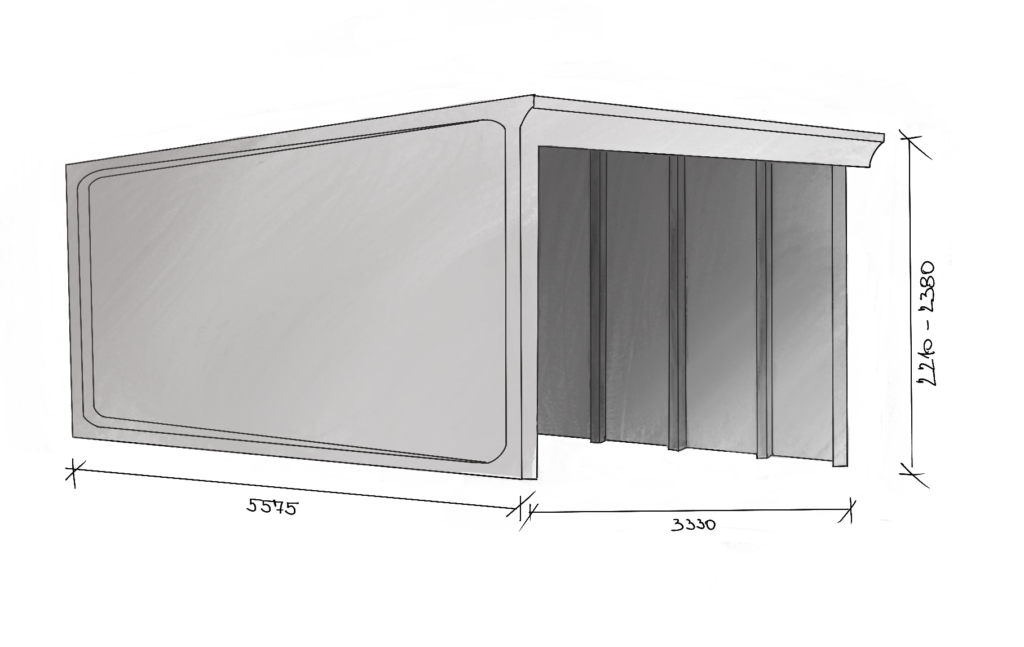 Vnější rozměry jsou 5 575 x 3 330 x 2 210 – 2 380 mm.